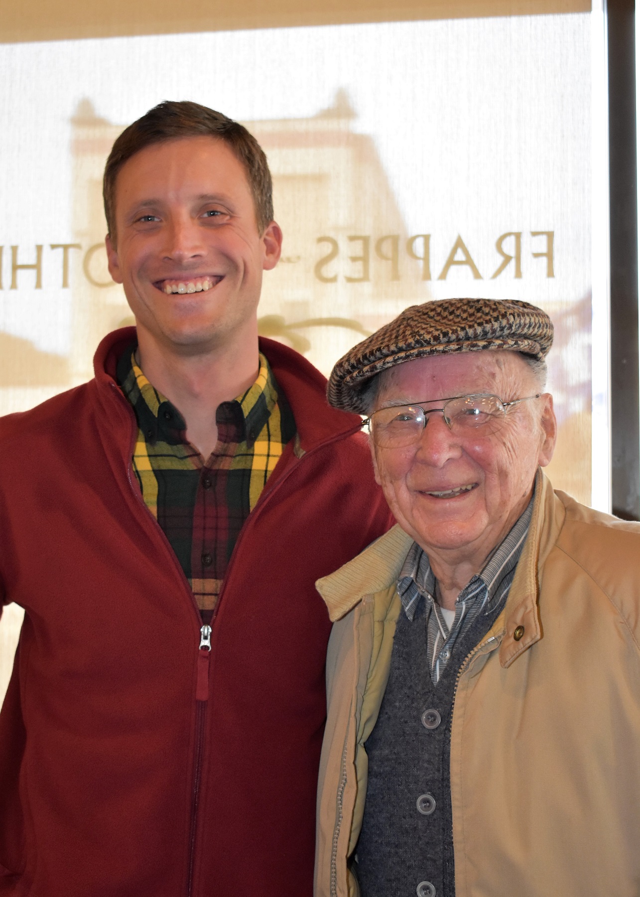 The current captain of Evelyn and the first captain of Benelly.Benjamin O. Severns built his Tahiti Ketch, Benelly, in a place you would not expect—rural Indiana. In January 2017, we had the pleasure of meeting Ben, then 94, and visiting him at his home where he built our boat decades ago. We drove through cornfields, past silos and round barns, until coming upon a small town with about thirty homes and a handful of streets. Once the town boasted a post office, a church and a school—now just the church survives, and just past it, down a dirt road before more cornfields unravel, is a barn built of wood salvaged from a tornado, with unusually large doors. Inside that barn, Ben toiled for ten years as he built his dream. He timed her completion with his retirement, and an oil trawler lamp that still hangs from the butterfly hatch was a parting gift from his co-workers.